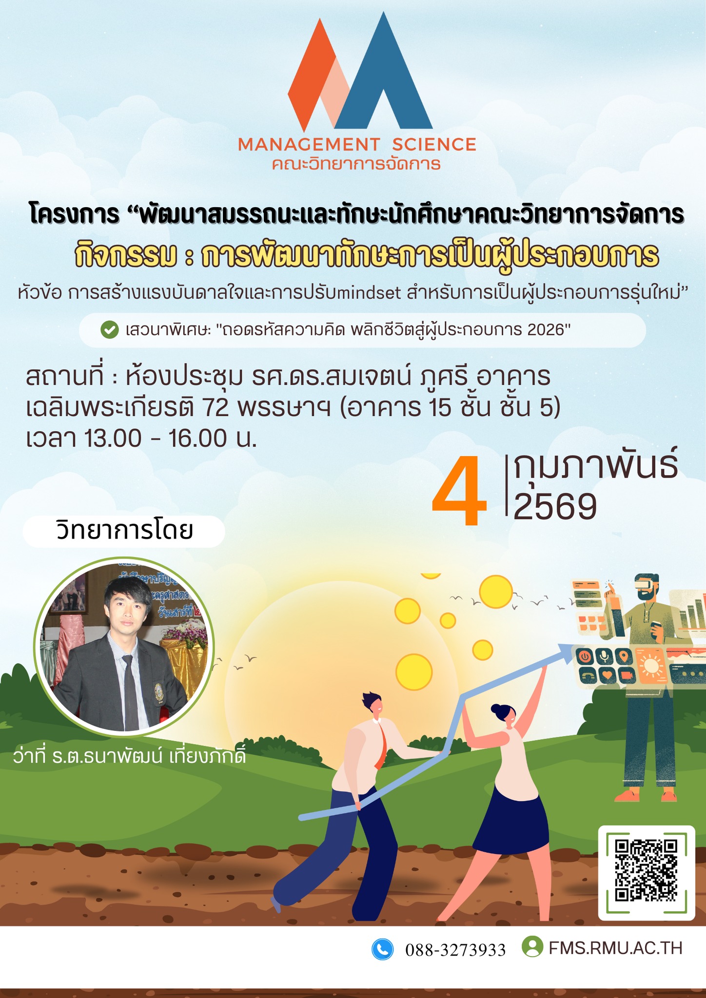 📢 พบกับการเสวนาพิเศษในหัวข้อ “ถอดรหัสความคิด พลิกชีวิตสู่ผู้ประกอบการ 2026” ได้รับเกียรติจาก ว่าที่ร้อยตรี ธนาพัฒน์ เที่ยงภักดี เจ้าของกิจการไร่พารวย ร่วมค้นหาคำตอบของการสร้างแรงบันดาลใจ และการปรับ Mindset เพื่อเตรียมความพร้อมให้นักศึกษาก้าวสู่การเป็นผู้ประกอบการในโลกยุคใหม่ได้อย่างมั่นคง